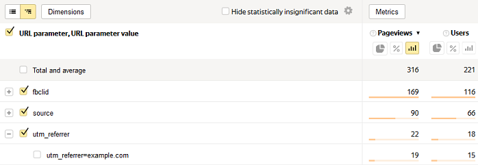 您可以使用此报表来跟踪其他 URL 参数的统计信息,例如 utm_referrer 标签,以便更准确地确定流量来源。