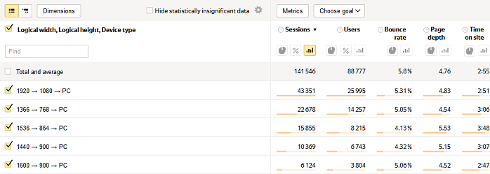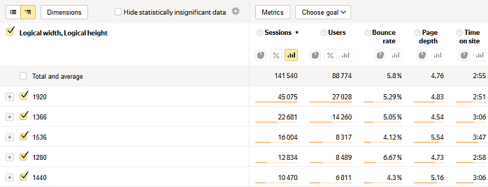 此报表的示例可用于 Yandex Metrica 演示计数器。