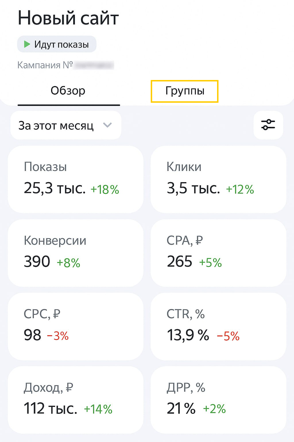 На экране Кампании отображаются все кампании, созданные в аккаунте Директа. Здесь видны их статус, название, номер и топ-3 метрики.