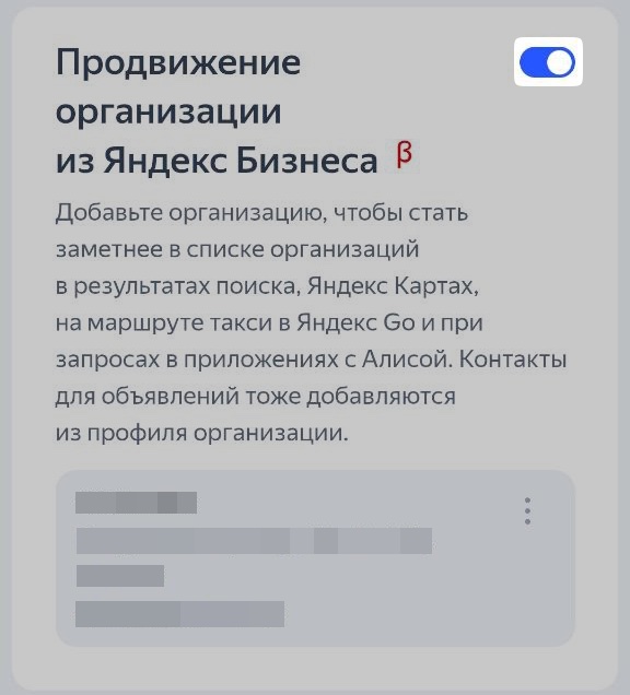 Чтобы показывать объявления в Яндекс Картах, включите опцию в блоке Продвижение организации из Яндекс Бизнеса. Если по указанной ссылке Директ автоматически не найдет организацию в Картах, свяжите организацию с кампанией вручную.