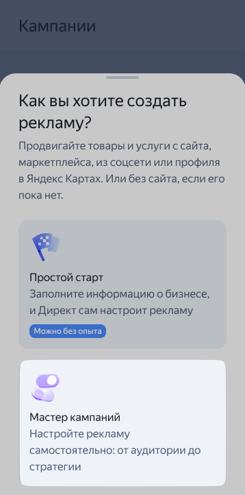 Для продвижения сайта через Мастер кампаний достаточно указать ссылку на продвигаемую страницу. На каждом шаге создания объявления Мастер подсказывает настройки, тематические слова, тексты и картинки.