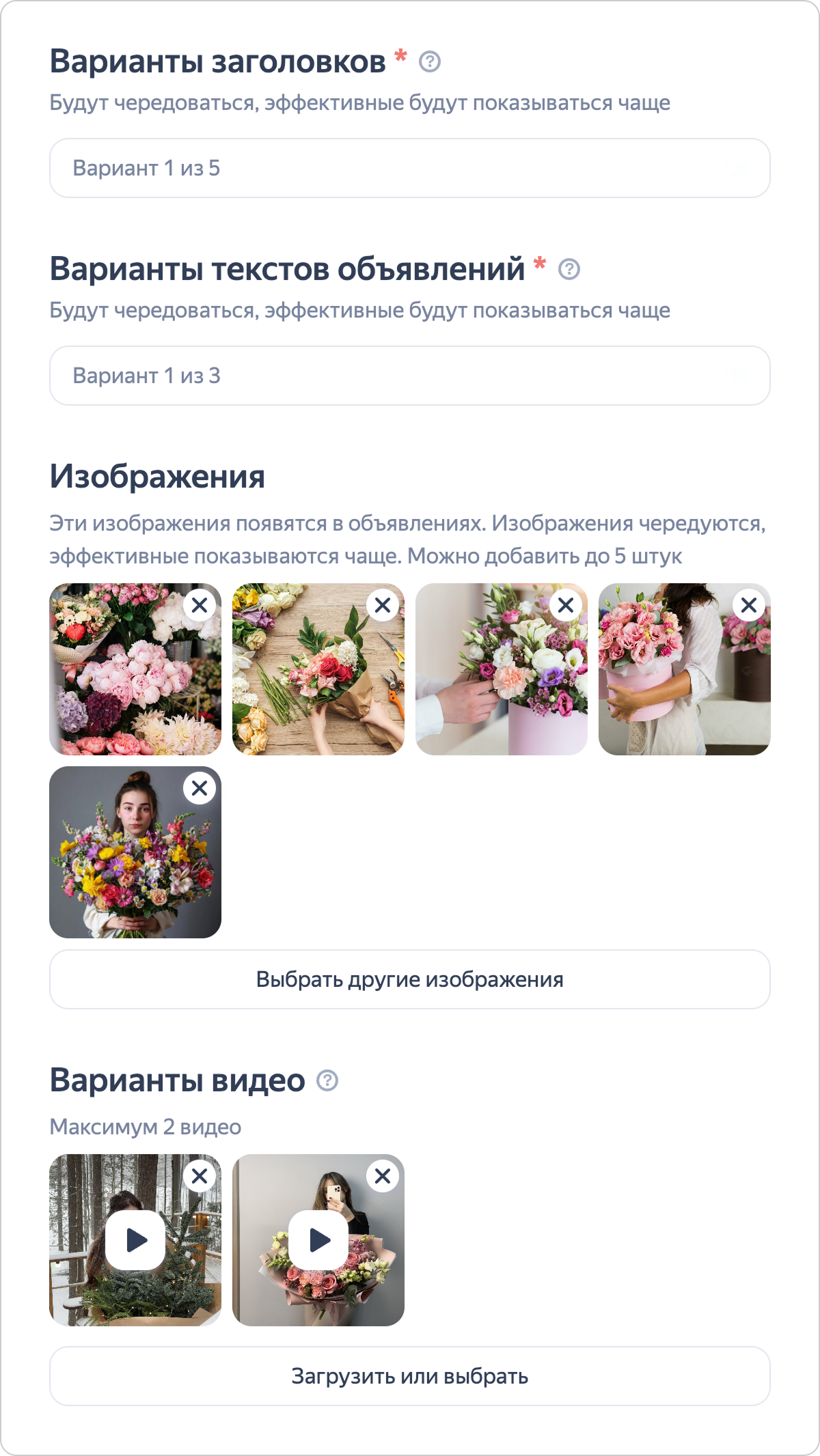 На основе вашего сайта будут подобраны до пяти вариантов заголовка и изображений и до трех вариантов текстов. Эти элементы объявлений будут комбинироваться между собой при показах — проверьте, что все элементы взаимно сочетаются и не противоречат друг другу.