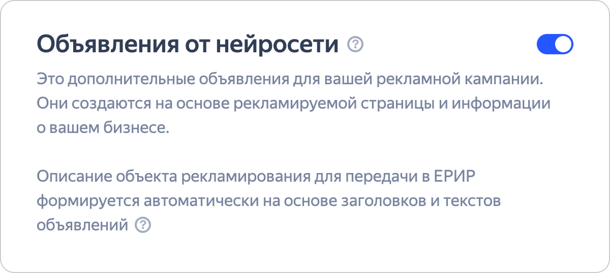 Это дополнительные объявления для вашей кампании. Они генерируются на основе продвигаемой страницы и информации о конкретной организации. Объявления создаются на базе нового поколения нейротехнологий — Yandex Neuro Ads.