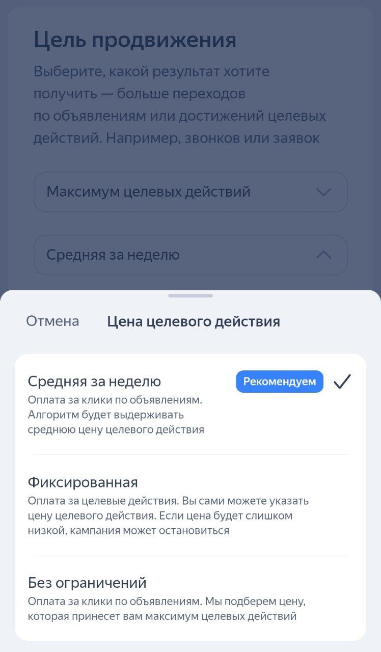 В блоке Цель продвижения выберите цели кампании: «Максимум переходов» или «Максимум целевых действий». Укажите вид цены целевого действия или цены перехода.