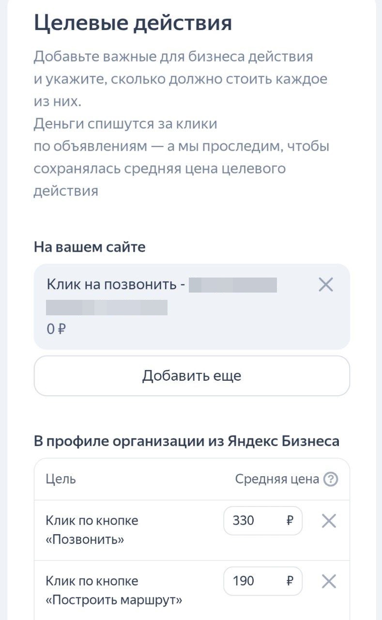 В блоке Целевые действия добавьте важные для бизнеса действия и укажите, сколько готовы платить за каждое из них.