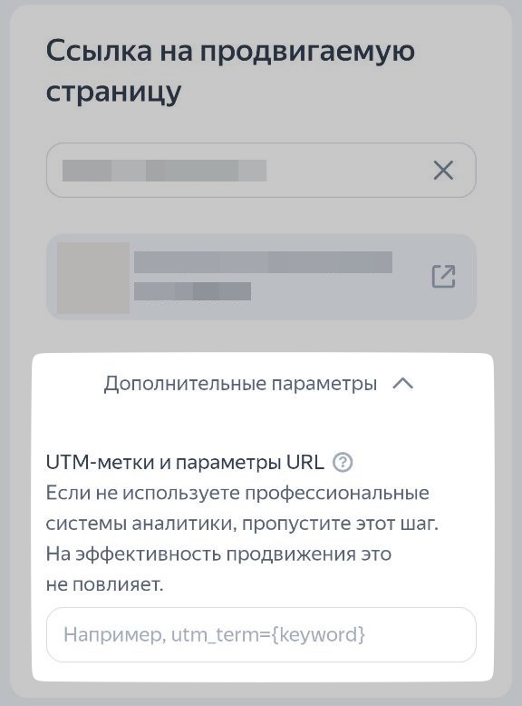 Чтобы добавить в ссылку UTM-метки или другие параметры URL, в блоке Ссылка на продвигаемую страницу раскройте Дополнительные параметры и введите значение.