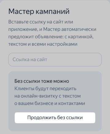 Если у вас нет сайта, воспользуйтесь продвижением без сайта. Для этого нажмите Продолжить без ссылки.
