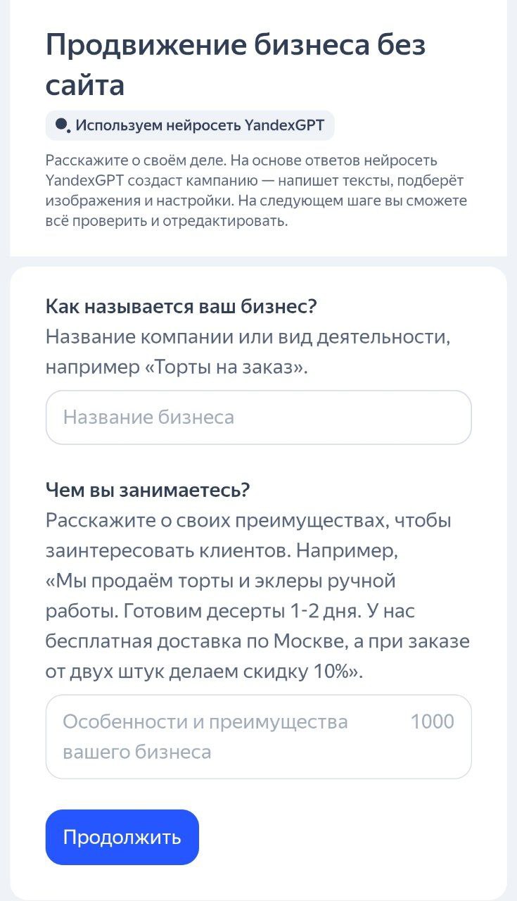 Если у вас нет сайта, для размещения объявлений через Мастер кампаний достаточно написать пару предложений о своем деле, а нейросеть Яндекса поможет с остальным — создаст онлайн-визитку с текстом и контактами, поможет с настройками, тематическими словами и картинками.