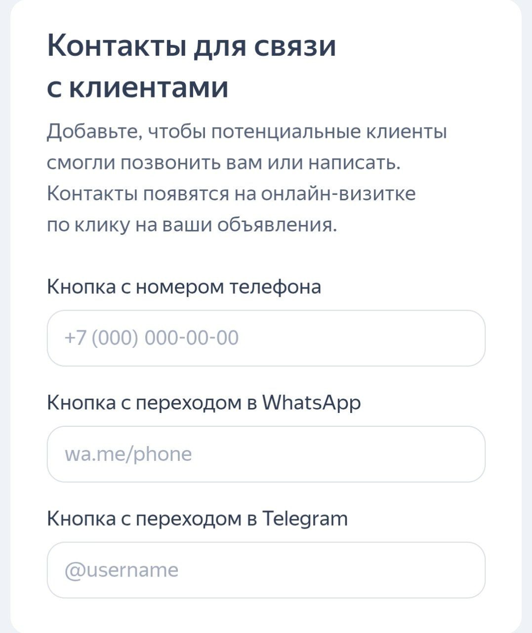 Укажите хотя бы один из контактов: номер телефона, WhatsApp или Telegram. Клик по кнопке с контактом на онлайн-визитке будет целью этой кампании.