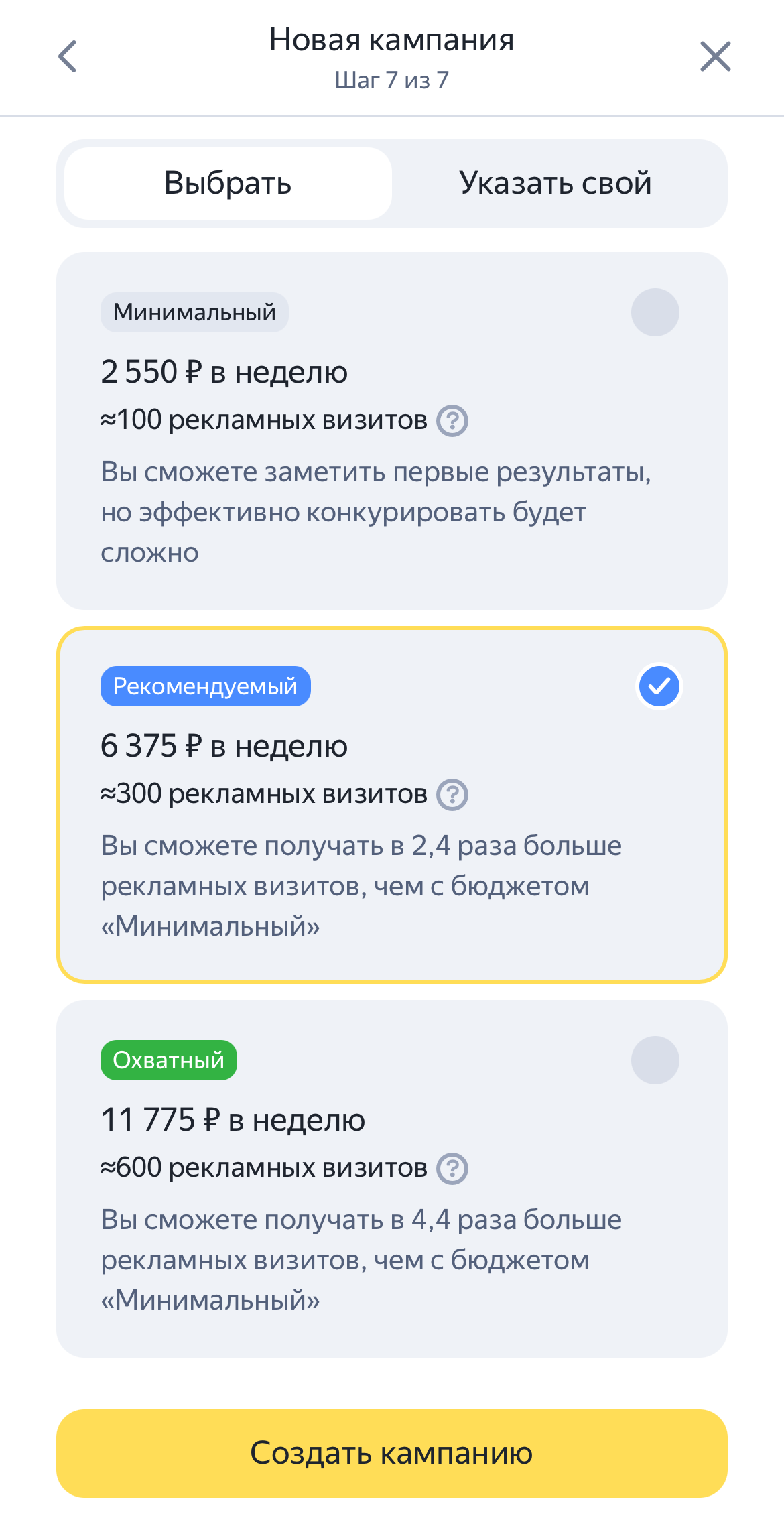 Бюджеты рассчитаны по статистике трат у конкурентов. Чем больше бюджет, тем выше вероятность, что вы выиграете аукцион и получите больше трафика.