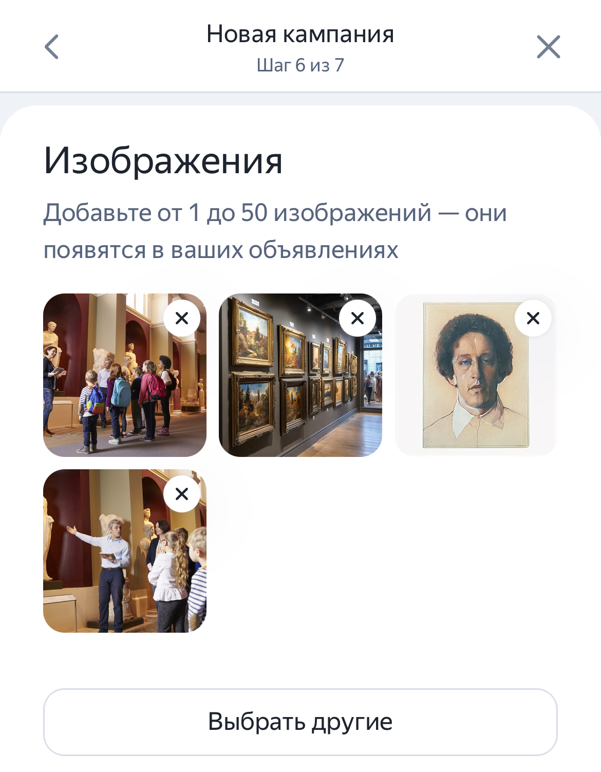 Алгоритм Директа уже подобрал несколько изображений для создания объявлений: с сайта, из фотостока или среди сгенерированных нейросетью. Если нужно, замените их на другие.