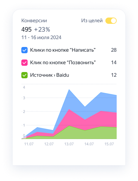 - Конверсии — количество целевых действий на сайте, совершенных пользователем.