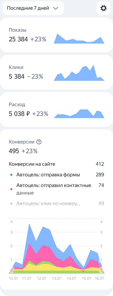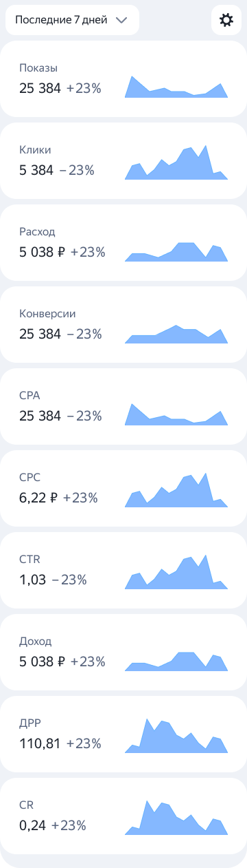 На карточке каждого показателя отображается изменение в процентах по сравнению с аналогичным предыдущим периодом. Например, если выбран период «Эта неделя», сравнение идет с предыдущей неделей. Аналогично вчерашний день сравнивается с позавчерашним, последние 30 дней с предыдущими и т. д.