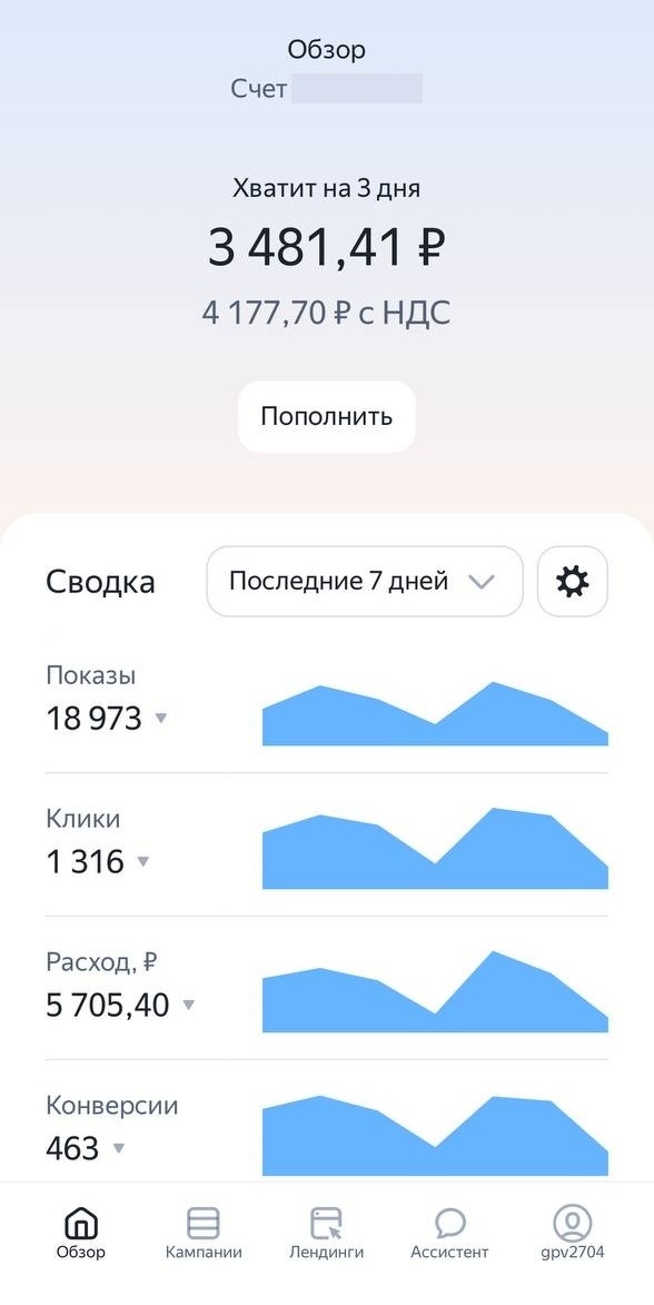 На экране Обзор вы можете посмотреть сводную статистику по всем активным кампаниям за выбранный период. Также можно открыть нужную метрику и посмотреть ее детализацию в шторке.