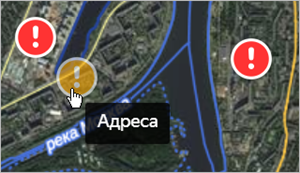 Точки отображаются оранжевыми или красными (если неточность зарегистрирована больше суток назад и не исправлена) кружками с восклицательным знаком.
