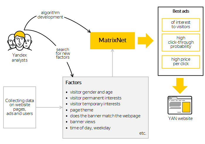 We always strive to provide users with the most precise answer, and this applies to ads as well. MatrixNet lets us expand the number of factors that we consider when displaying ads on the Advertising Network, which means that our ads better match the interests of users as well as the goals of advertisers and site owners.