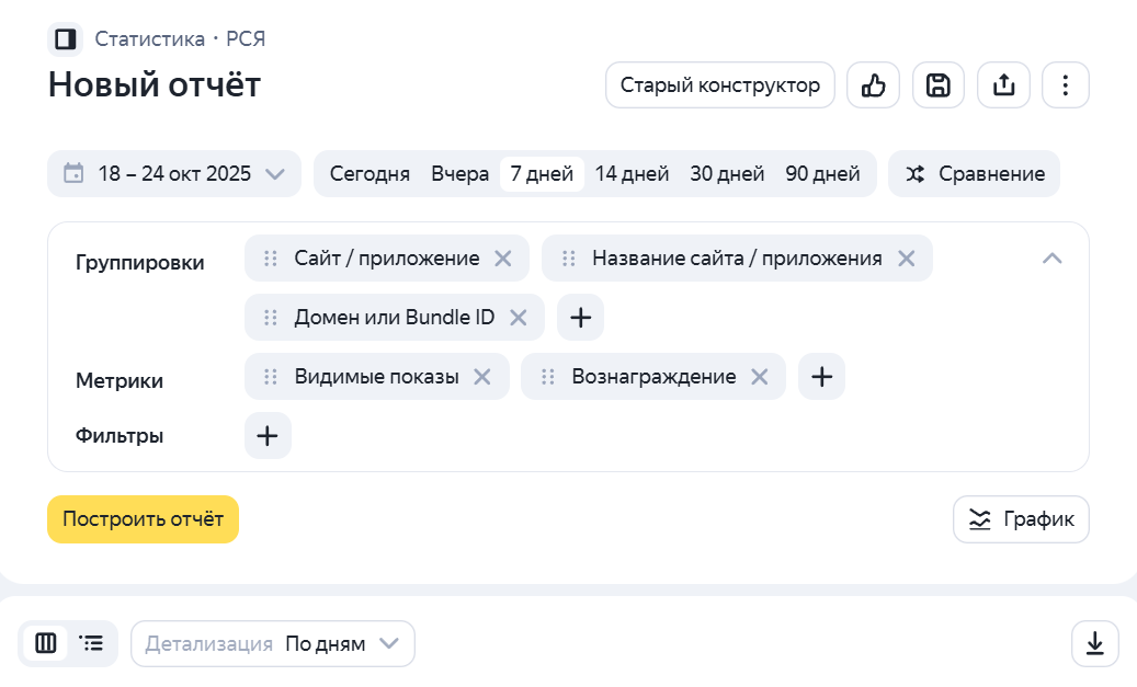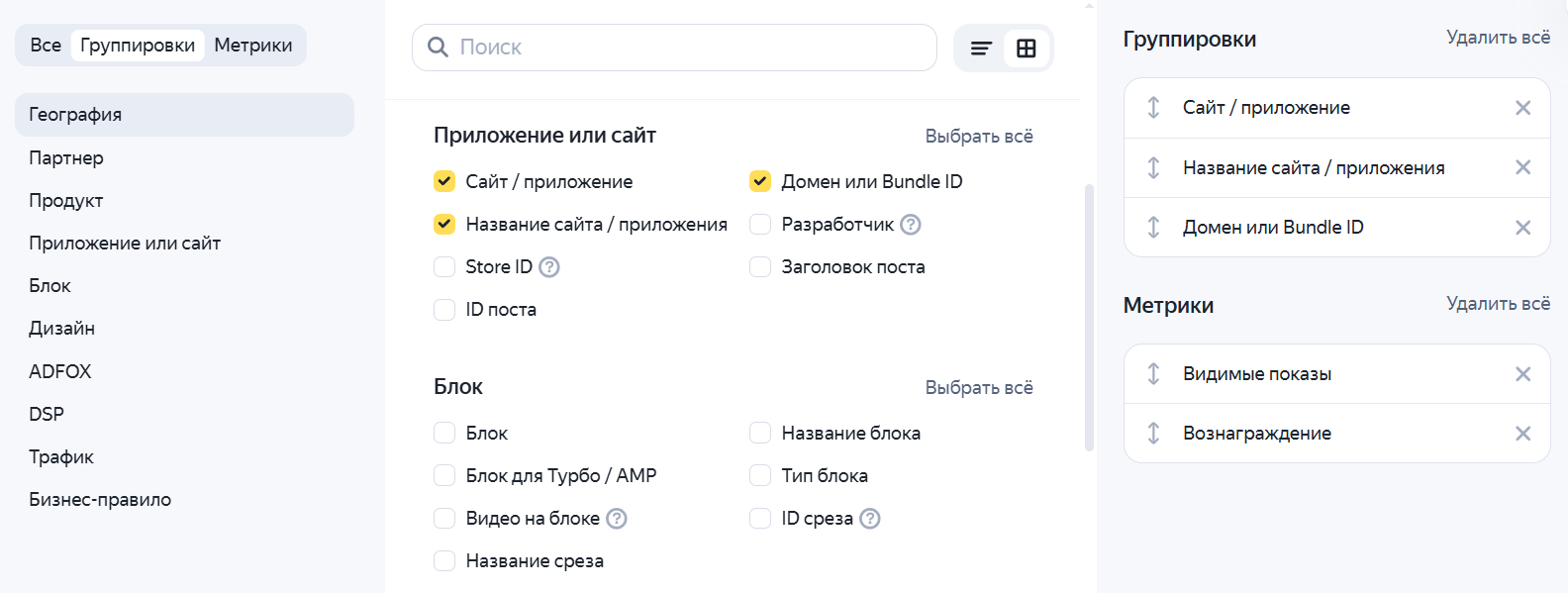 Например, чтобы посмотреть, какие сайты приносят наибольшее вознаграждение, можно сгруппировать данные по домену, ID и названию сайта. Добавьте соответствующие группировки: Домен или Bundle ID, Сайт / приложение, Название сайта / приложения.
