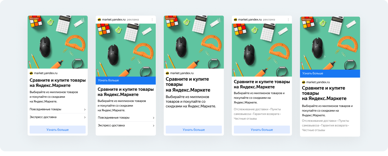 Smart Design — технология Рекламной сети Яндекса на основе машинного обучения, которая автоматически собирает объявления с разными дополнениями для каждого показа.