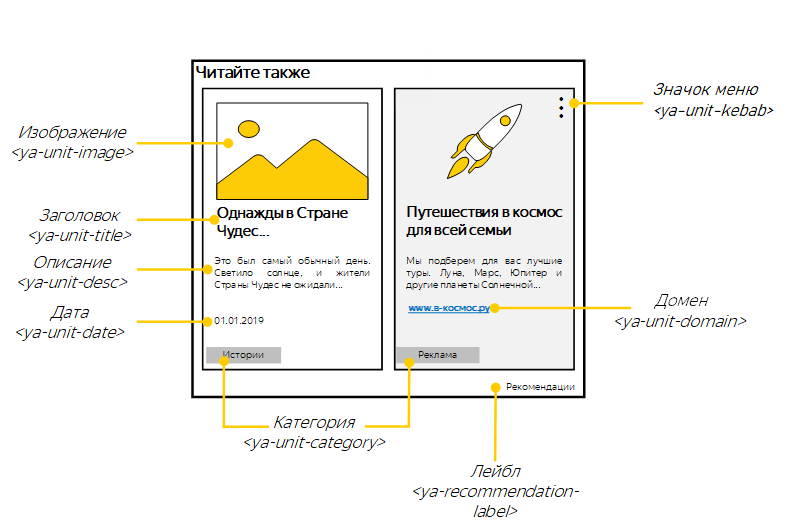 Вы можете определить набор элементов, из которых будет состоять объявление в рекламной карточке: заголовок, текст, картинка и т. п. Часть элементов является обязательными — это требование законодательства в сфере рекламы и правил Рекламной сети Яндекса. Другие элементы являются дополнительными: используйте их, чтобы органично вписать рекламное объявление на ваш ресурс и повысить конверсионность виджета.