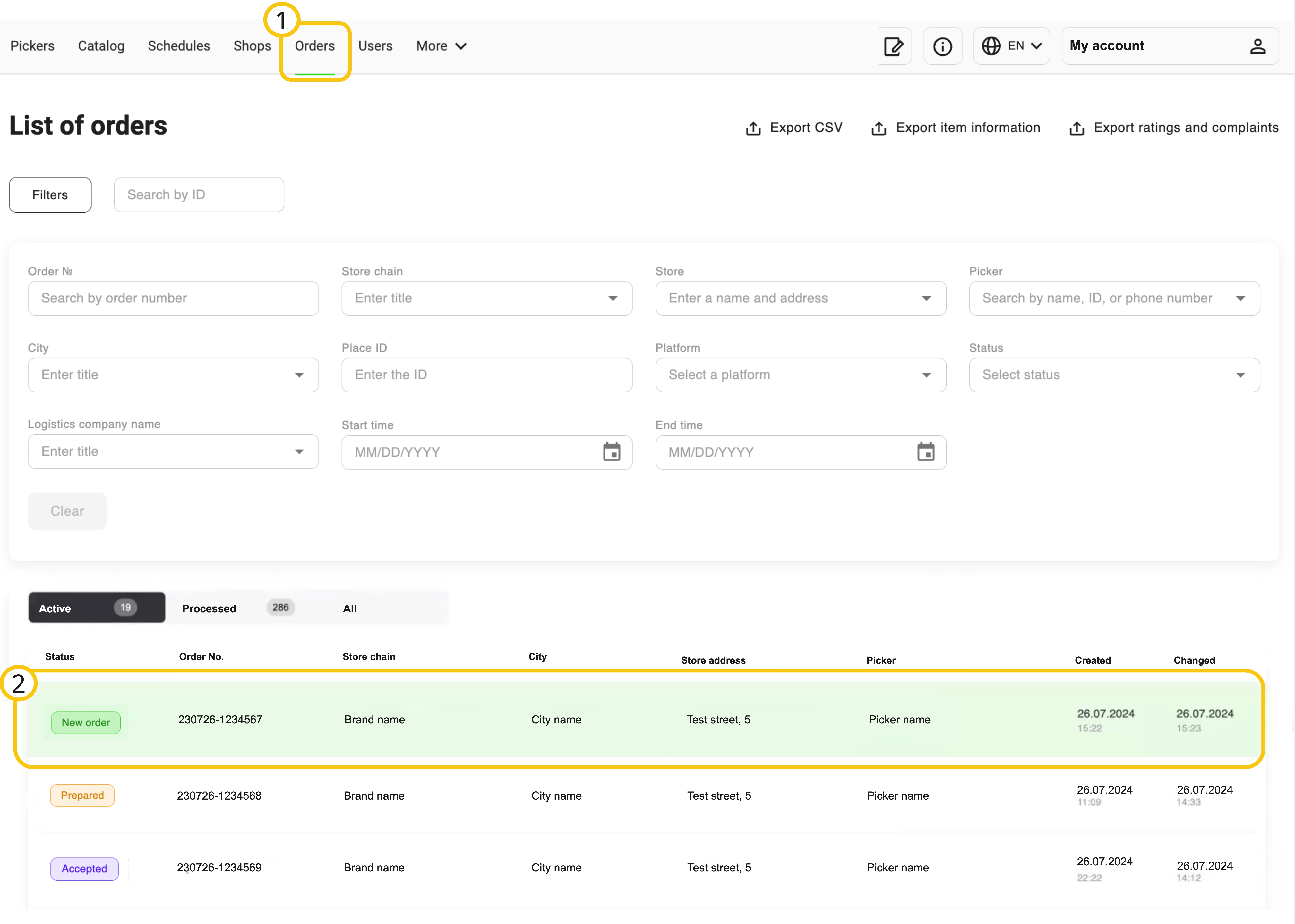Aktiv bölməsində siz toplanması hələ də davam edən və tamamlanmamış sifarişləri görə bilərsiniz. Sifarişi toplamaga başlamaq üçün yeni sifariş olan sətirə klikləyin.