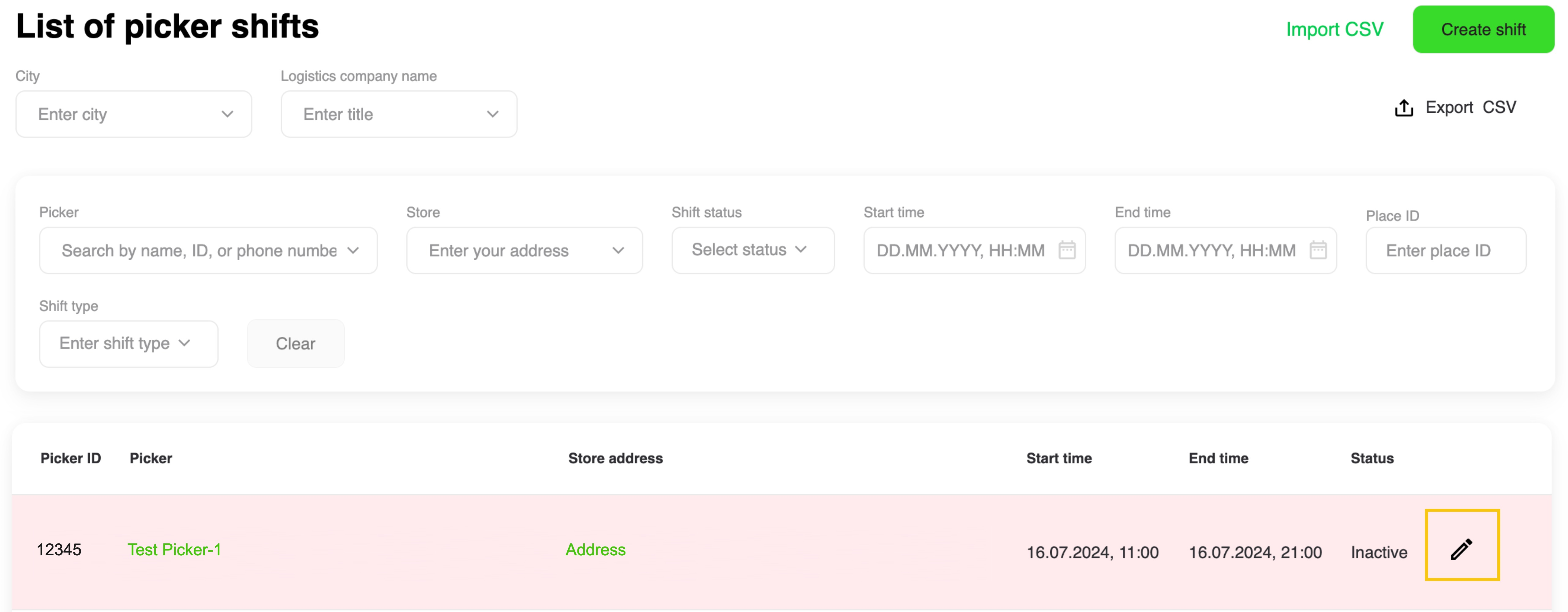 Select a picker, a shop for his work and set a shift time.
