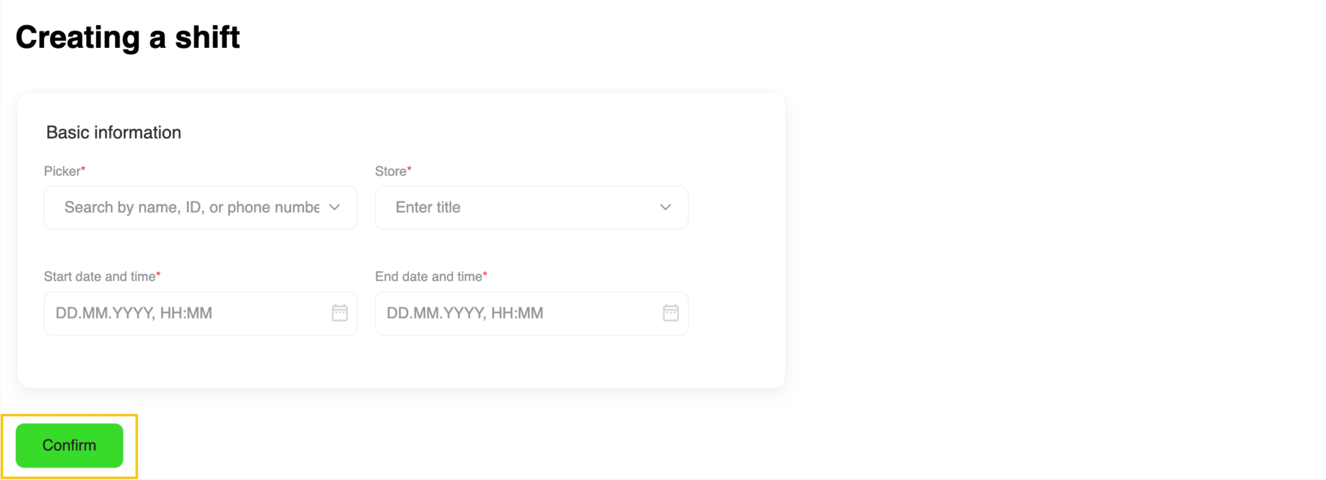 - La poste de travail du préparateur n'a pas été créée ou le préparateur s'est connecté sous un autre numéro. Vérifiez le shift dans l'onglet Horaires. Si le préparateur est connecté à l'application avec le bon numéro de compte et qu'il ne voit pas le bouton pour commencer l'équipe, vérifiez que la carte du préparateur n'est pas bloquée. Si le préparateur n'est pas bloqué et qu'il n'y a pas de shift, créez-la manuellement.