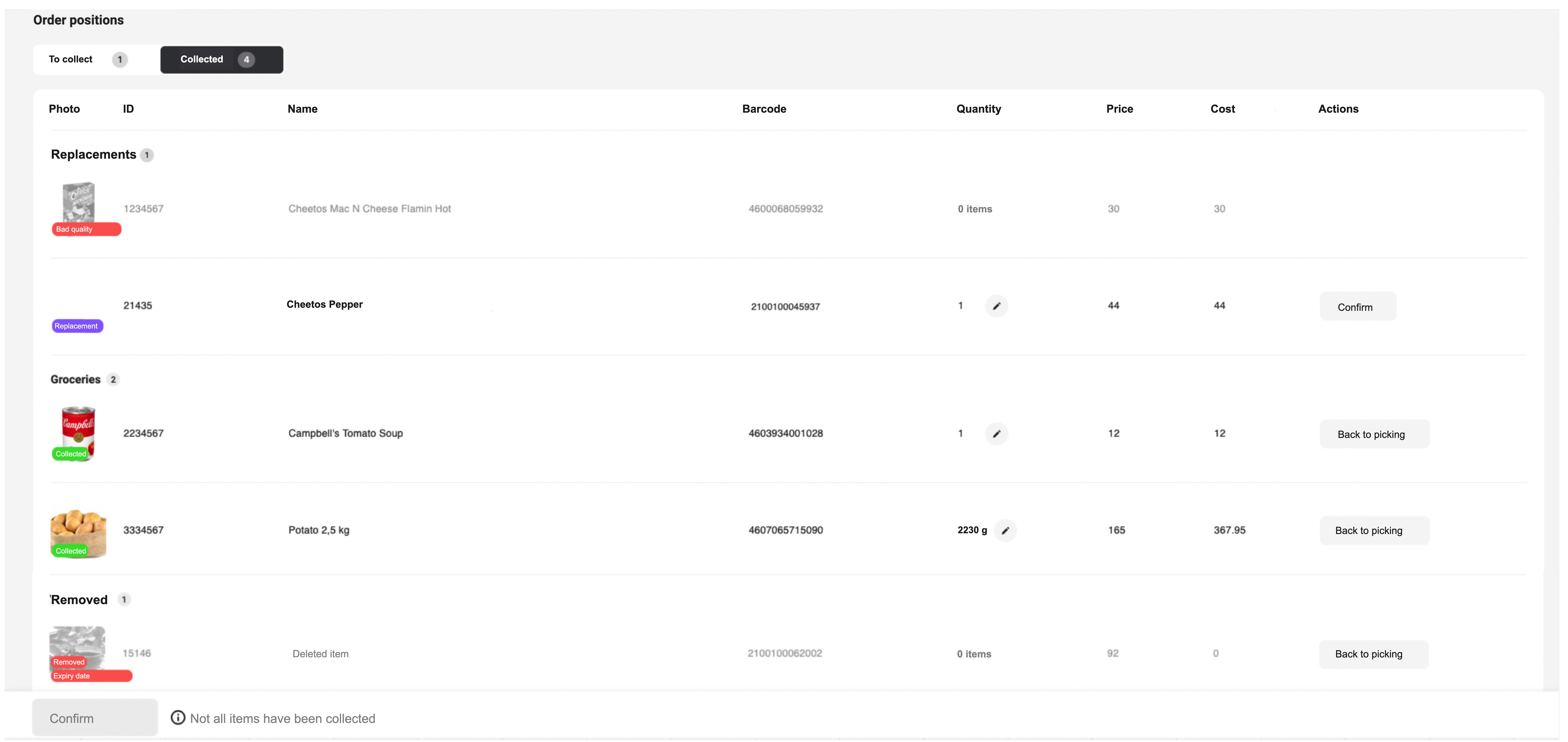 Եթե ապրանքը պատահաբար ավելացվել է զամբյուղում և հայտնվել է հավաքված բաժնում, այդպիսի ապրանքի տողում սեղմեք վերադառնալ հավաքմանը և փոխարինեք այն վերը նշված հրահանգով:
