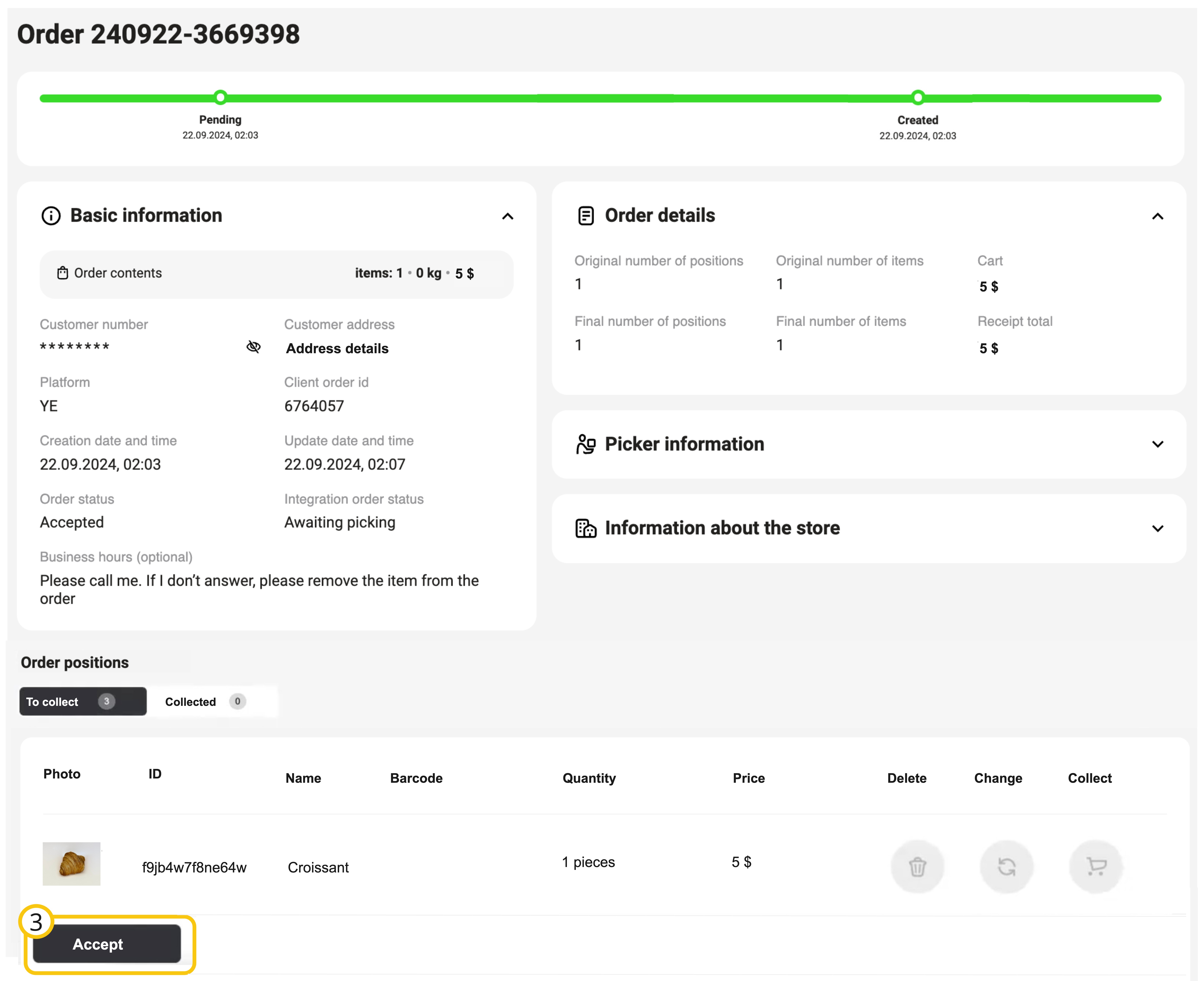 Կոճակը հասանելի է, քանի դեռ պատվերը հավաքման փուլում է: Պատվերը հավաքված կարգավիճակին փոխանցելուց հետո հնարավոր չի լինի պատճենել հաճախորդի համարը: