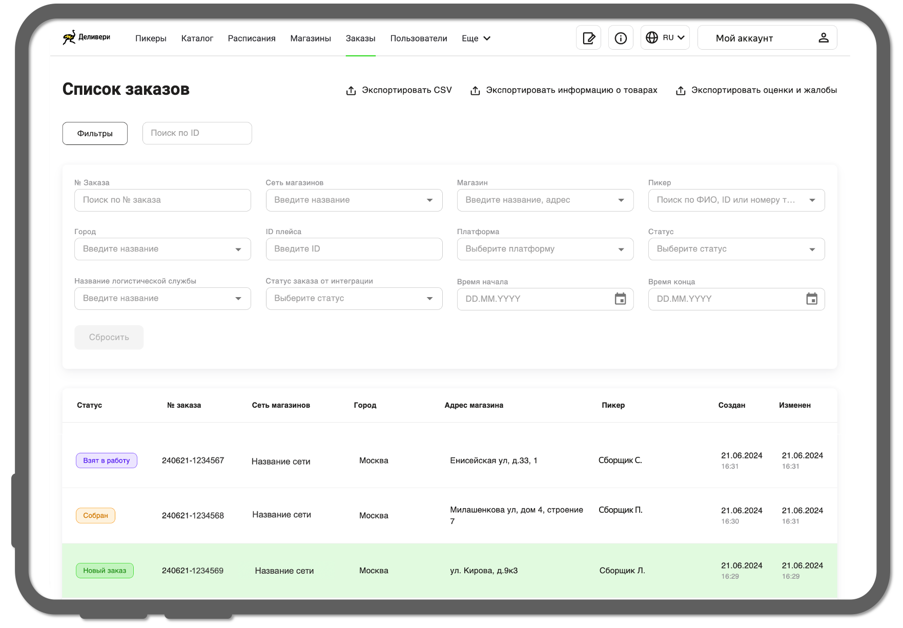 - выгрузить отчеты по заказам, пикерам, сменам.