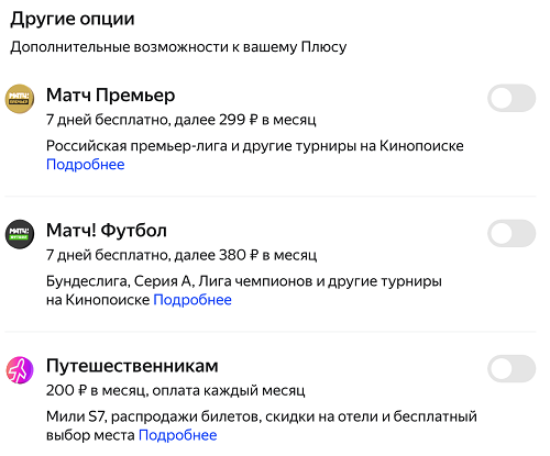 Опции — это дополнительные преимущества, которые можно добавить к своему Плюсу за отдельную плату.