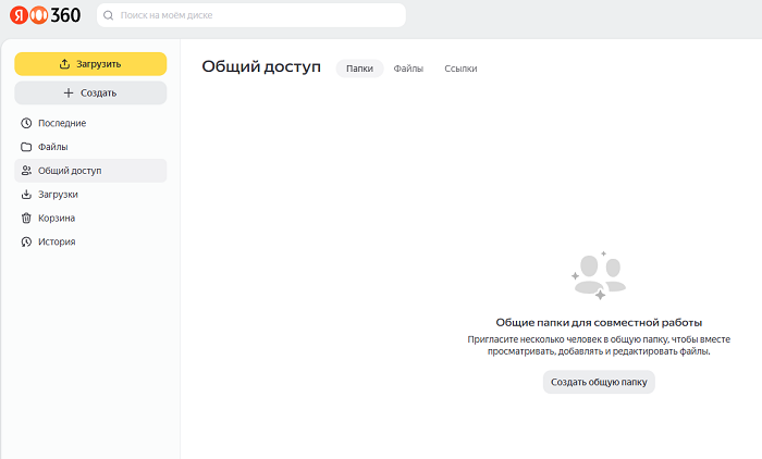 На вкладке Общий доступ можно создать общую папку, а также управлять папками с общим доступом.