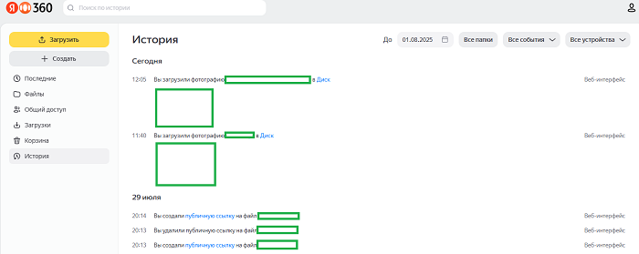 На вкладке История отображается вся история всех совершенных действий: добавление, удаление, загрузка, перемещение, переименование папок и файлов.