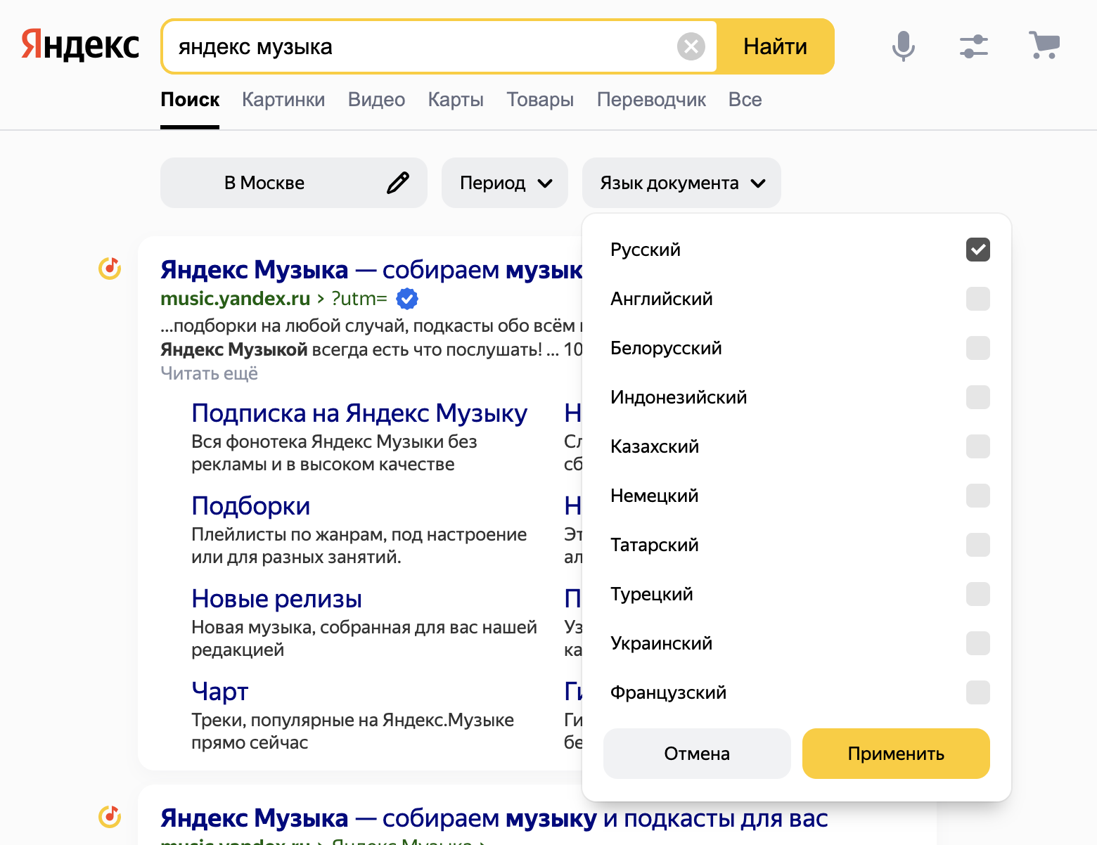 С помощью фильтров расширенного поиска вы можете искать сайты и документы на определенных языках.