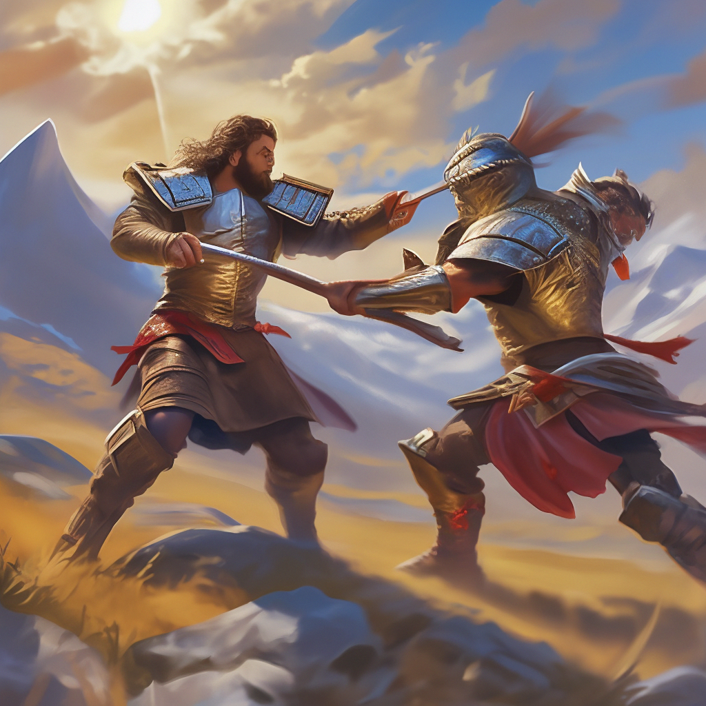 two warriors fighting on the battlefield, metal armor, sunny mountains
