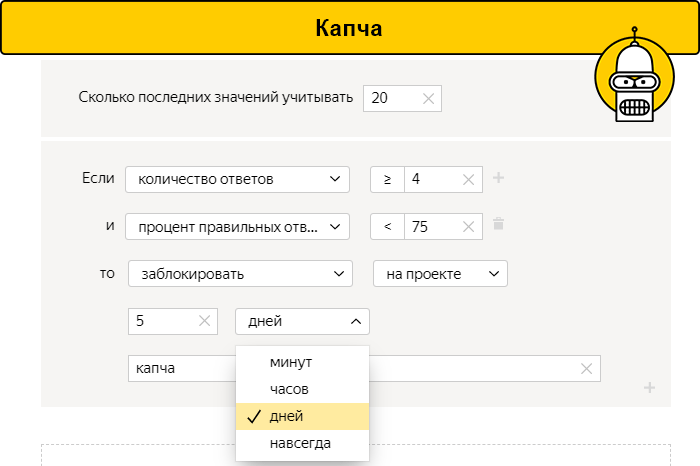 Настройте правило Капча, чтобы защититься от роботов. В Яндекс Заданиях ее показывают через каждые 10 страниц с заданиями. Если задания выполняются быстро и капча мешает, ее можно показывать через каждые 20 страниц — укажите в настройках пула низкую частоту показа капчи.