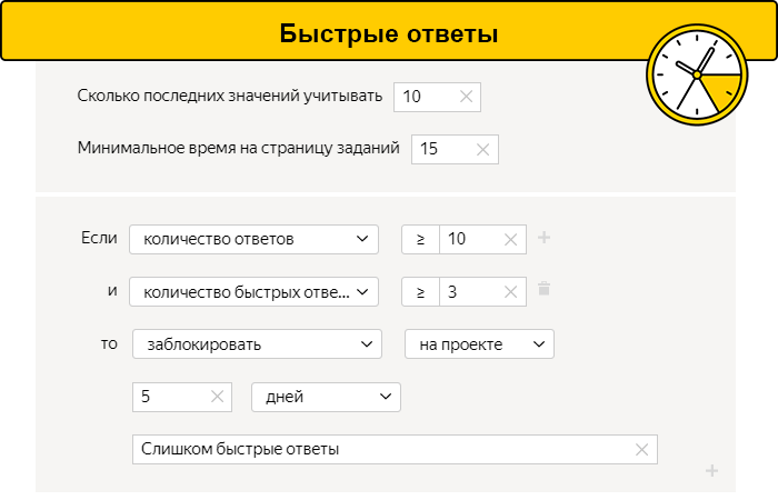 Настройте правило Быстрые ответы, чтобы отсеять недобросовестных исполнителей, которые выполняют задания слишком быстро и небрежно. Вы пробовали выполнять задания и знаете, что на одно задание требуется не менее 15 секунд. Стоит отстранить того, кто выполнит три задания из десяти быстрее контрольного времени.