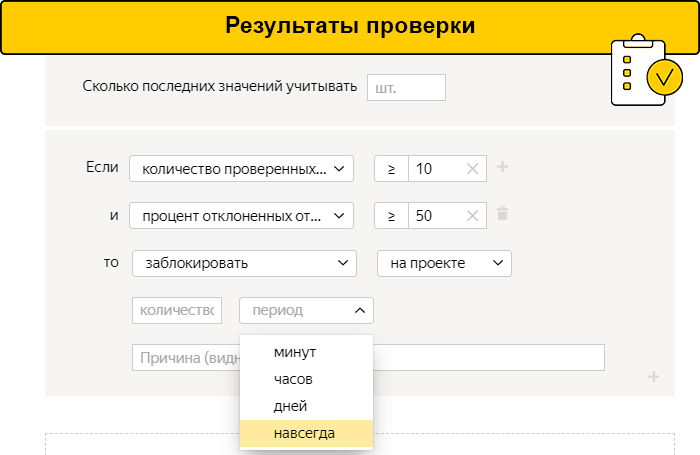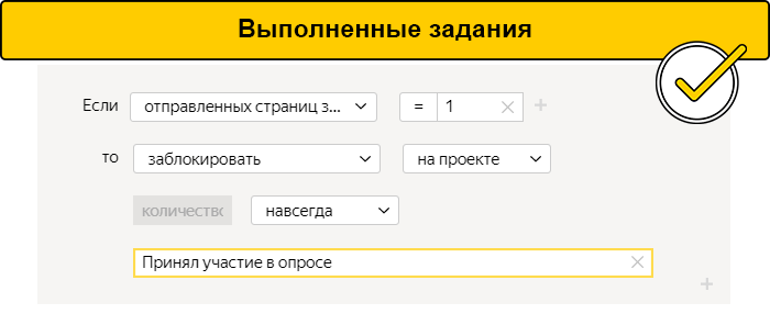 Используйте правило Результаты проверки, чтобы регулировать доступ исполнителей к заданию. Платформа сама подсчитает, какой процент ответов принят, а какой отклонен у каждого из исполнителей. Те, кто часто ошибался, перестанут получать задания.