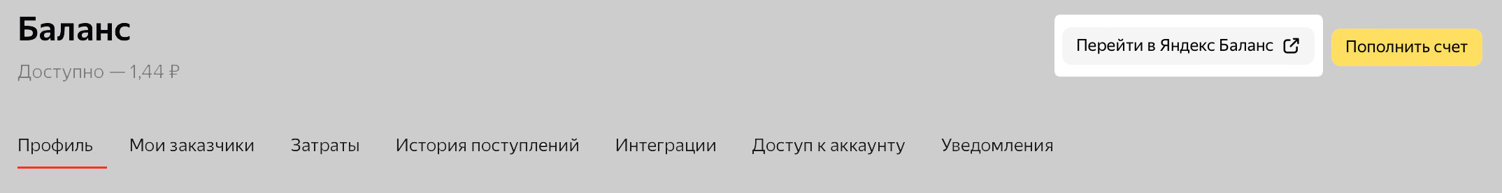 1. На странице Профиль нажмите Перейти в Яндекс Баланс.