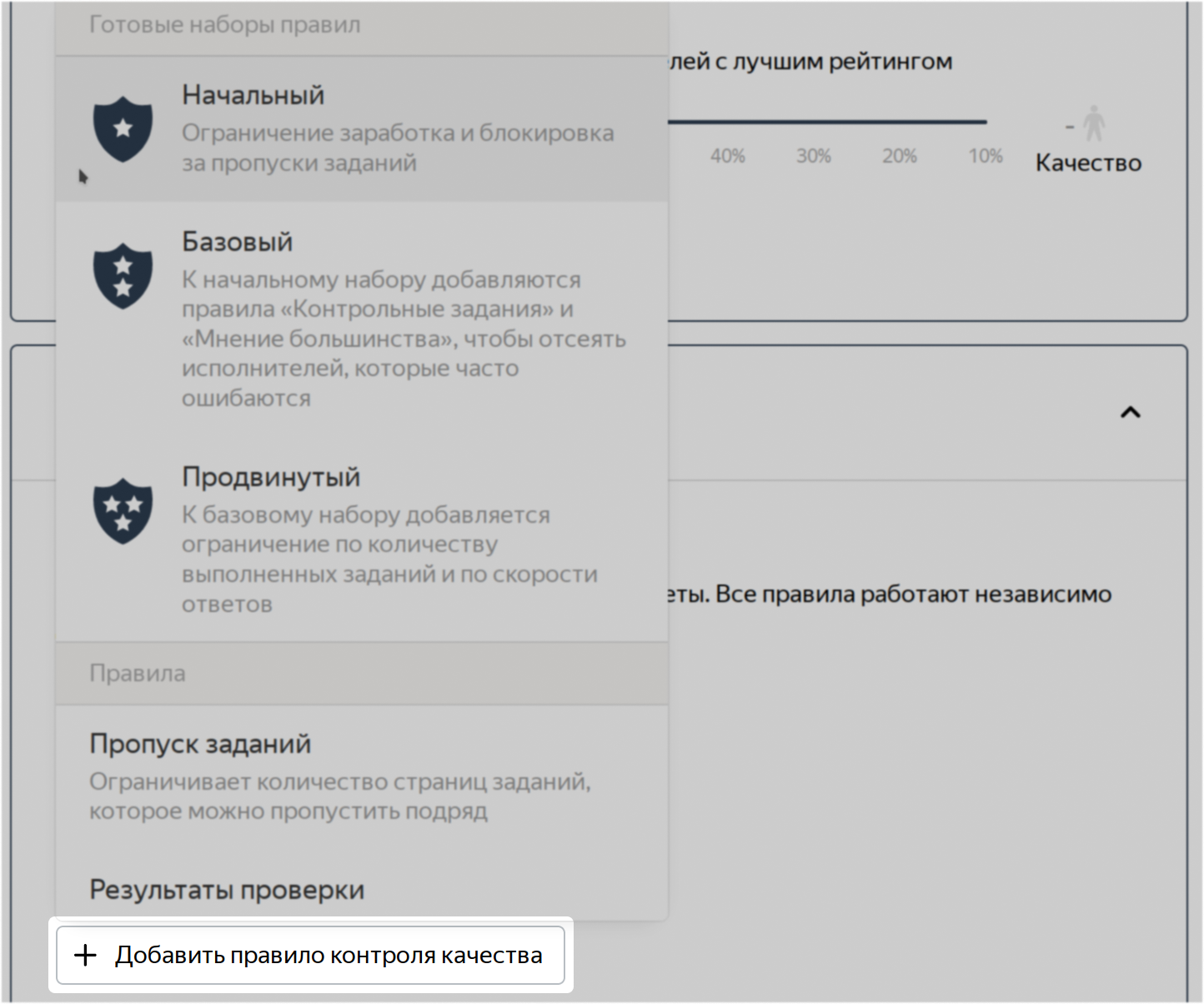 Добавьте и настройте правила контроля качества, чтобы получать более точные ответы. В разделе Контроль качества нажмите Добавить правило контроля качества, выберите правило контроля и настройте его. Также вы можете использовать готовый набор правил с настройками по умолчанию.