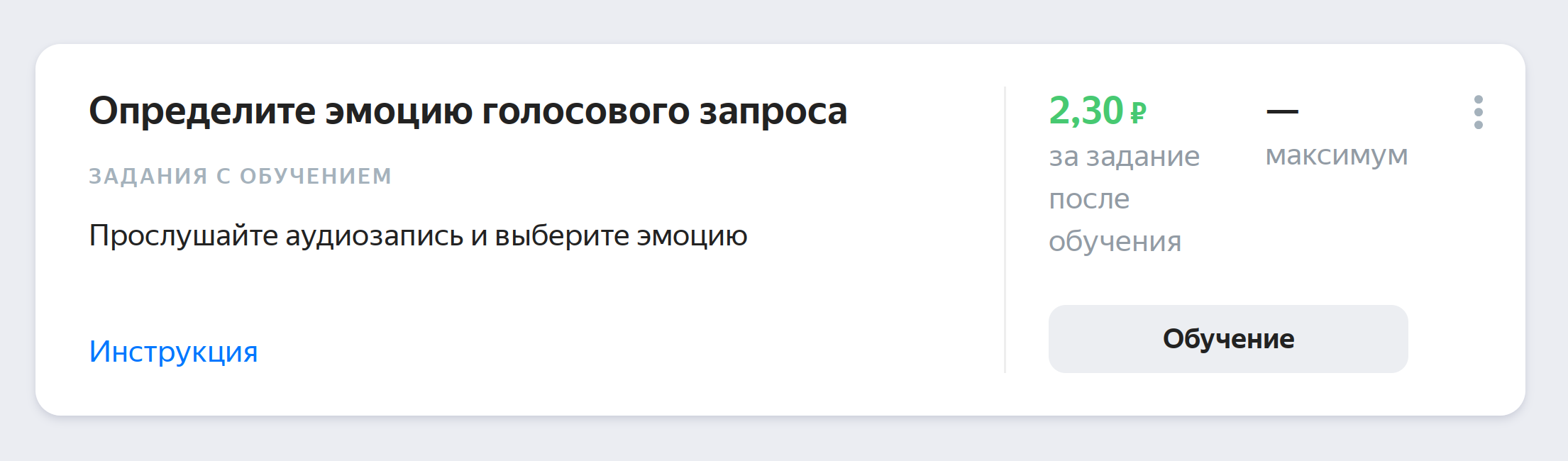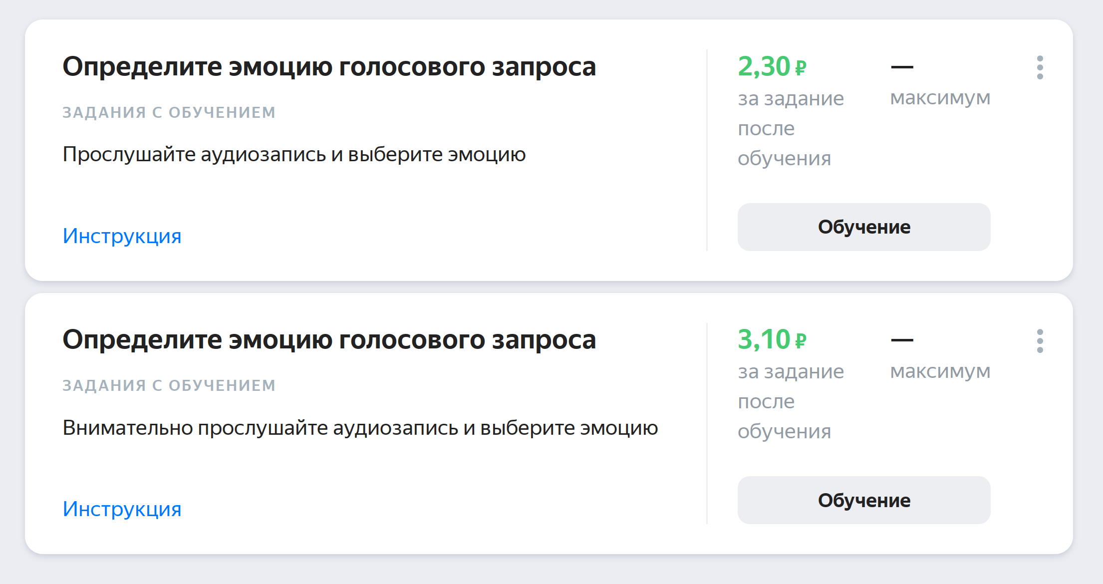 В этом примере исполнителю доступны два пула с разной ценой и публичным описанием, поэтому он видит у себя на странице две карточки с заданиями из этого проекта. Исполнитель сможет выбрать любую из них — например, где цена выше.