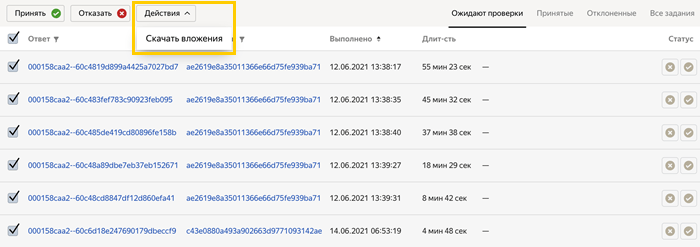 На странице пула нажмите кнопку Проверить задания (или Просмотреть задания, если задания уже приняты), чтобы перейти на страницу с ответами исполнителей. Каждая строка содержит ответ исполнителя на одну страницу заданий.