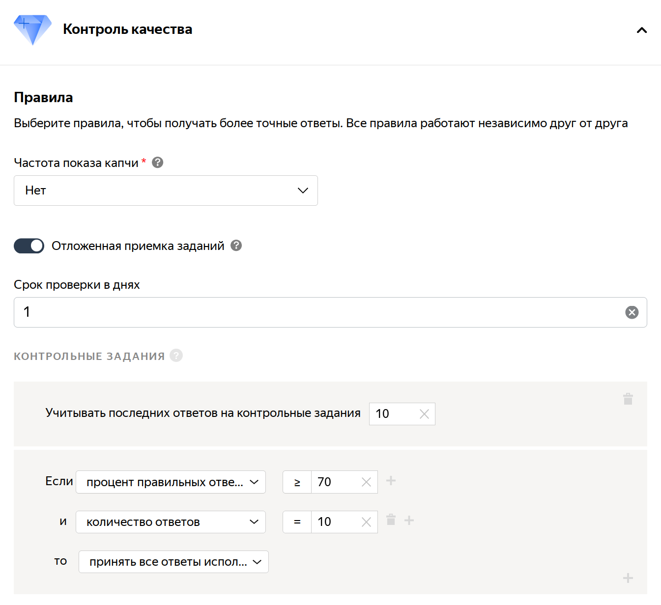 С помощью API Яндекс Заданий можно настроить частоту выдачи контрольных заданий. Например, на первой странице заданий сделать каждое пятое задание контрольным, на последующих — каждое десятое. Такая настройка позволит сохранить качество пула и ускорить выполнение заданий.