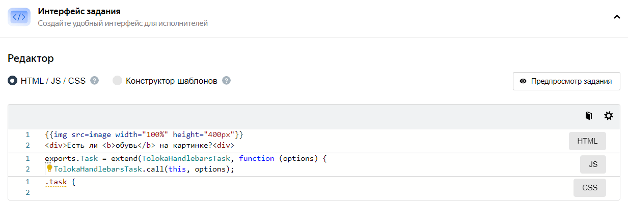 Справочник по настройке интерфейса описывает работу редактора HTML/JS/CSS. Вы также можете попробовать создать интерфейс задания в Конструкторе шаблонов.