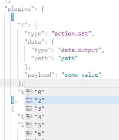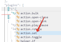 Компонент plugins.hotkeys пока пуст. Заполните его нужными значениями. Для этого установите курсор после открывающей фигурной скобки этого компонента и нажмите Tab. Последовательно появятся два списка: первый для выбора горячей клавиши, второй для назначения действия. В первом списке выберите горячую клавишу "1", во втором — действие action.set.