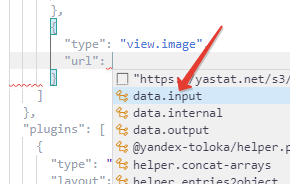 Добавьте следующий элемент. Для этого установите курсор за фигурной скобкой, закрывающей компонент view.text, поставьте запятую и нажмите Tab. Появится список, в котором надо выбрать компонент view.image. Он используется для отображения картинки. Его свойство url содержит ссылку на изображение. Удалите ссылку вместе с кавычками и нажмите Tab. Появится список, в котором надо выбрать компонент data.input. Он позволяет получить значения из примера входных данных.