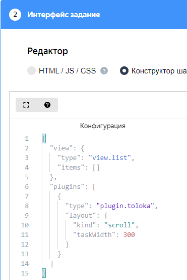 Конфигурация — редактор интерфейса задания в формате JSON. В нем есть автодополнение с подсказками и готовыми примерами кода.