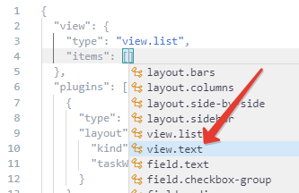 Вернитесь на панель Конфигурация. Добавьте в свойство items компонента view.list массив элементов будущего интерфейса. Для этого установите курсор внутрь квадратных скобок и нажмите Tab. Появится список, в котором надо выбрать компонент view.text. Измените значение его свойства content на "Посмотрите на картинку и ответьте на вопрос.". Этот текст появится над картинкой в качестве заголовка задачи.
