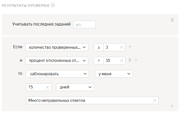 Это означает, что если 35% и более ответов исполнителя будут отклонены, он будет заблокирован и не сможет больше выполнять ваши задания 15 дней. Правило начинает действовать после проверки 3 ответов исполнителя.