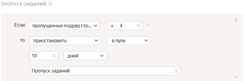 Задайте правило для пропущенных заданий: если пропущенных подряд страниц заданий ≥ 4, то приостановить в пуле на 10 дней. В поле Причина введите Пропуск заданий.