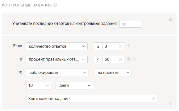 Это означает, что если исполнитель выполнил более трех контрольных заданий и дал неправильные ответы более чем в 60% из них, он будет заблокирован и не сможет выполнять задания на этом проекте в течение 10 дней.